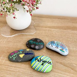Colour Rocks Using Oil Pastels: Collect smooth rocks and colour them with bright colors. Write positive messages like “You are loved” or “Smile!” on the rocks.