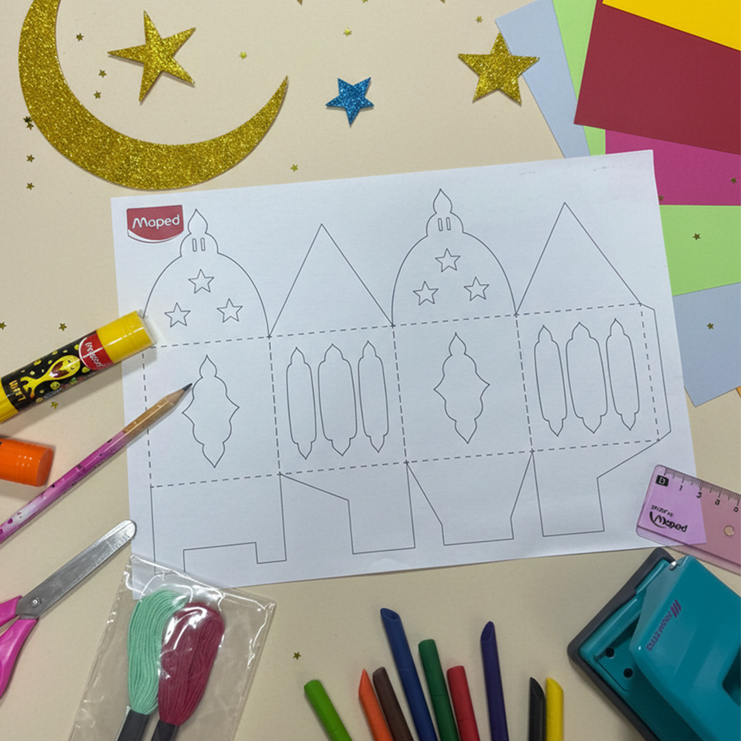 Colour all the elements in bright, joyful tones to reflect the spirit of Ramadan and create a beautiful glowing effect once the light is inside.