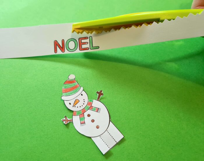 Cut around the shape, then follow the dotted lines to cut the foot into 3 smaller strips. Next, cut out the word ‘NOEL’. Finally, use the pinking shears along the top edge to give it a snowy look.
