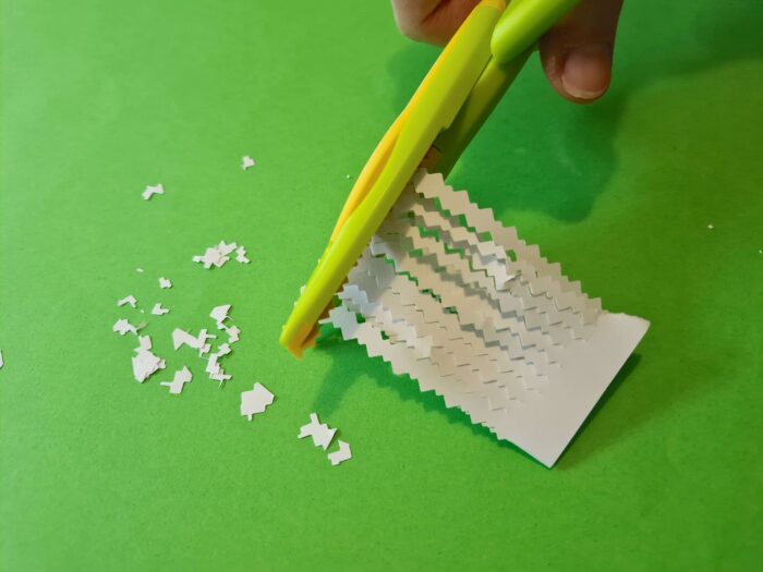 Create the snow by cutting white paper in one direction, then in the other, using pinking shears.