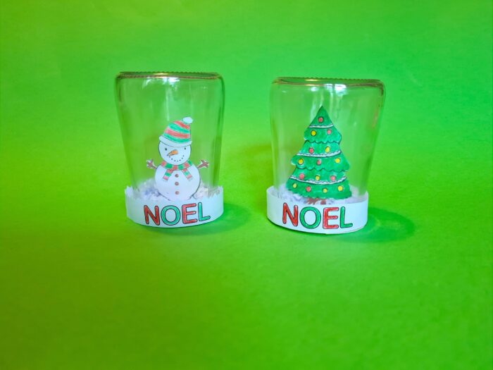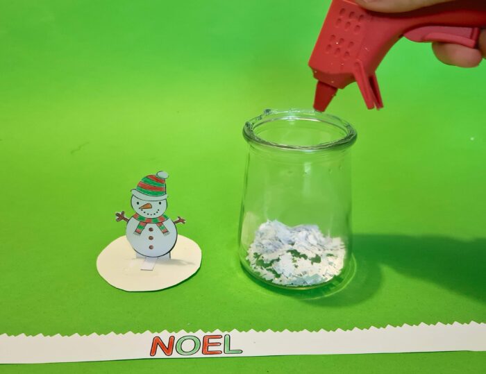 Fill the jar with the snow pieces and then glue the cardboard circle with the shape onto the jar. Finally, glue the word “NOEL” to the jar.