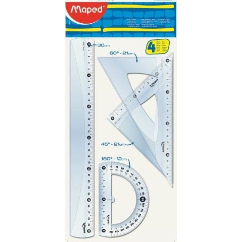 Maped Drawing Set Essential 4 Piece – includes 30cm ruler, protractor, and 2 set squares. Ideal for geometry, maths and drawing at school or home.
