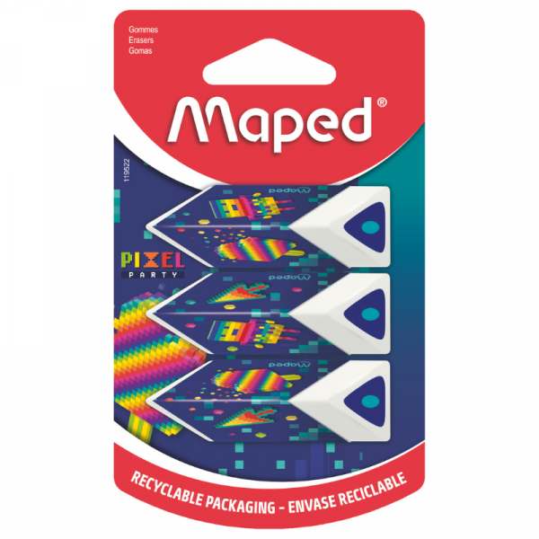 Maped Pixel Party Erasers – Set of 3 Pyramid Erasers, Precision White Erasers, Ergonomic Shape, PVC-Free, Recyclable Packaging
