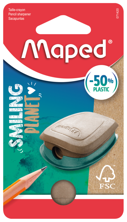 THE RESPONSIBLE PENCIL SHARPENER: Composed of 50% FSC-certified wood fibres, this Smiling Planet pencil sharpener with canister lives up to its name! This responsible composition reduces the amount of plastic by 50%.