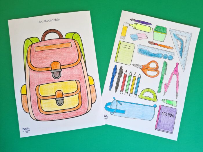 Colour all the items. On the one printed sheet, the school bag and on the other, the school supplies.