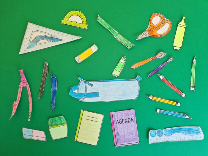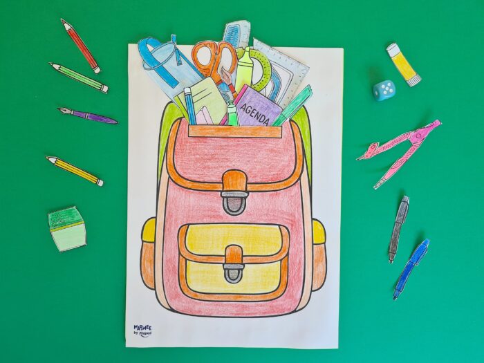 This simple DIY involves printing, cutting out, and assembling a paper schoolbag, along with a set of illustrated school supplies.