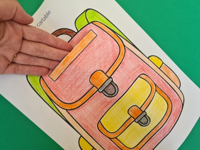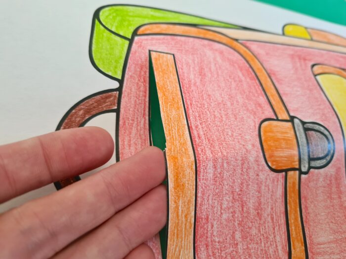 Glue the schoolbag onto an A4 sheet. Apply glue only along the sides and bottom, leaving the top open so you can remove the supplies once the game is finished.